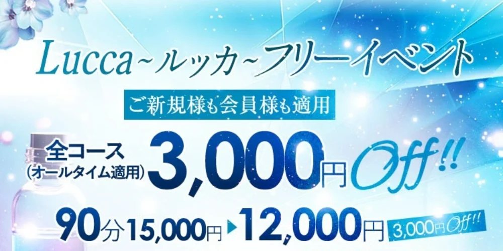 - 当店の最上級コースが3000円オフでお得です。 名前が紛らわしいですがフリーでなくてもご利用いただけます!(笑) 通常90分コース 15000円→12000円 ※ご指名は別途1000円